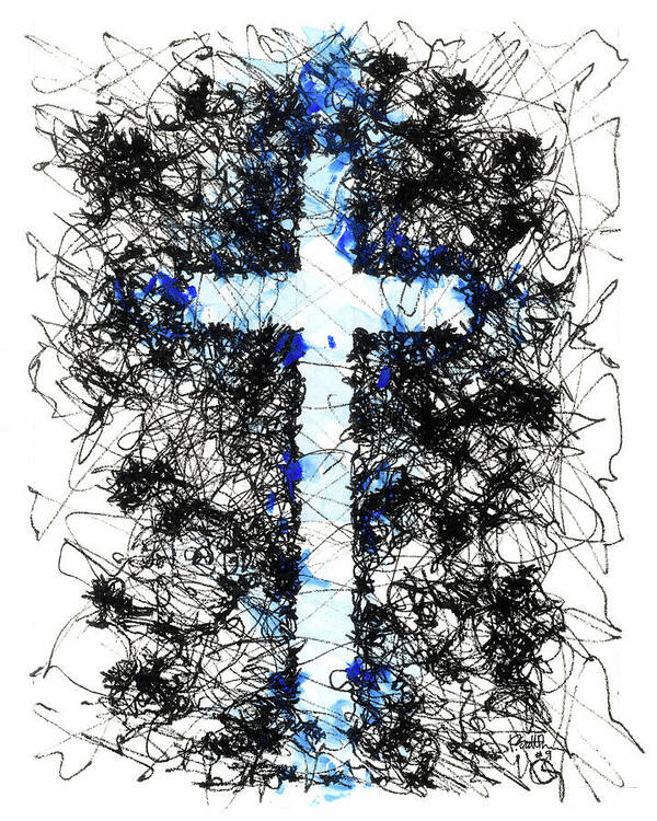 This soothing blue cross artwork exudes a sense of serenity and balance amidst life's intricate complexities. The soft blue tones reflect The Glorious Mysteries of the Rosary, symbolizing divine peace, eternal hope, and the majesty of the heavens. Surrounded by dynamic black ink strokes, the cross emerges as a steady presence, inviting moments of calm and spiritual grounding. Displaying this piece encourages introspection and tranquility, enriching your home or space with a reflective and inspiring presence.