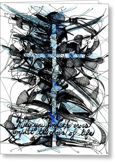 This vibrant blue and black cross artwork, accompanied by the message "May you find the cross amidst the chaos of life," emphasizes the serenity found in faith amidst life's complexities. The intricate black ink lines intertwine dynamically with the radiant blue tones, symbolizing the Glorious Mysteries of the Rosary—divine peace, eternal hope, and heavenly majesty. Sending heartfelt messages or thoughtful notes with this card inspires moments of connection and tranquility, offering both artistic beauty and spiritual meaning.