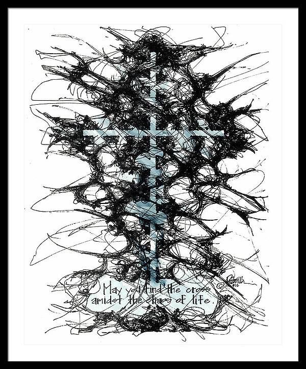 This serene blue and black cross artwork, paired with the message "May you find the cross amidst the chaos of life," embodies the calm and grounding influence of faith amidst life's challenges. The subtle blue tones symbolize The Glorious Mysteries of the Rosary, representing divine peace and quiet reflection. The flowing black ink lines weave together life’s trials, with the cross standing as a beacon of hope and gratitude. Displaying this piece creates a contemplative and peaceful atmosphere in any space.