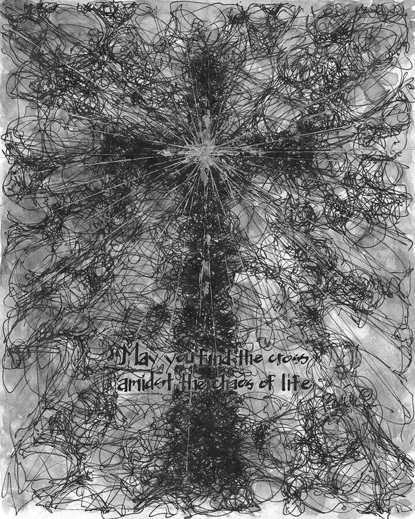 This black and white cross artwork, paired with the message "May you find the cross amidst the chaos of life," features a radiant burst emanating from the center of the cross, symbolizing divine light breaking through life's darkness. The intricate black ink and watercolor textures mirror the complexities of life, with the cross standing as a steadfast beacon of hope, faith, and order. This piece invites introspection and offers a calming spiritual presence, grounding any space in reflection and peace.