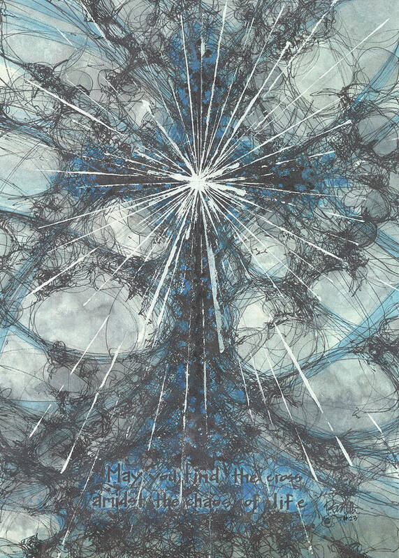 This magnificent cross design is imbued with the deep serenity of blue tones, accented by silver acrylic and dynamic bursts of energy radiating from the center. The interplay of black ink, blue ink, and watercolor conveys the divine mysteries and the calming majesty of the heavens. A radiant burst symbolizes the light of hope and love breaking through life’s chaos. Paired with the heartfelt message "May you find the cross amidst the chaos of life," this piece invites moments of reflection, peace, and gratitude.